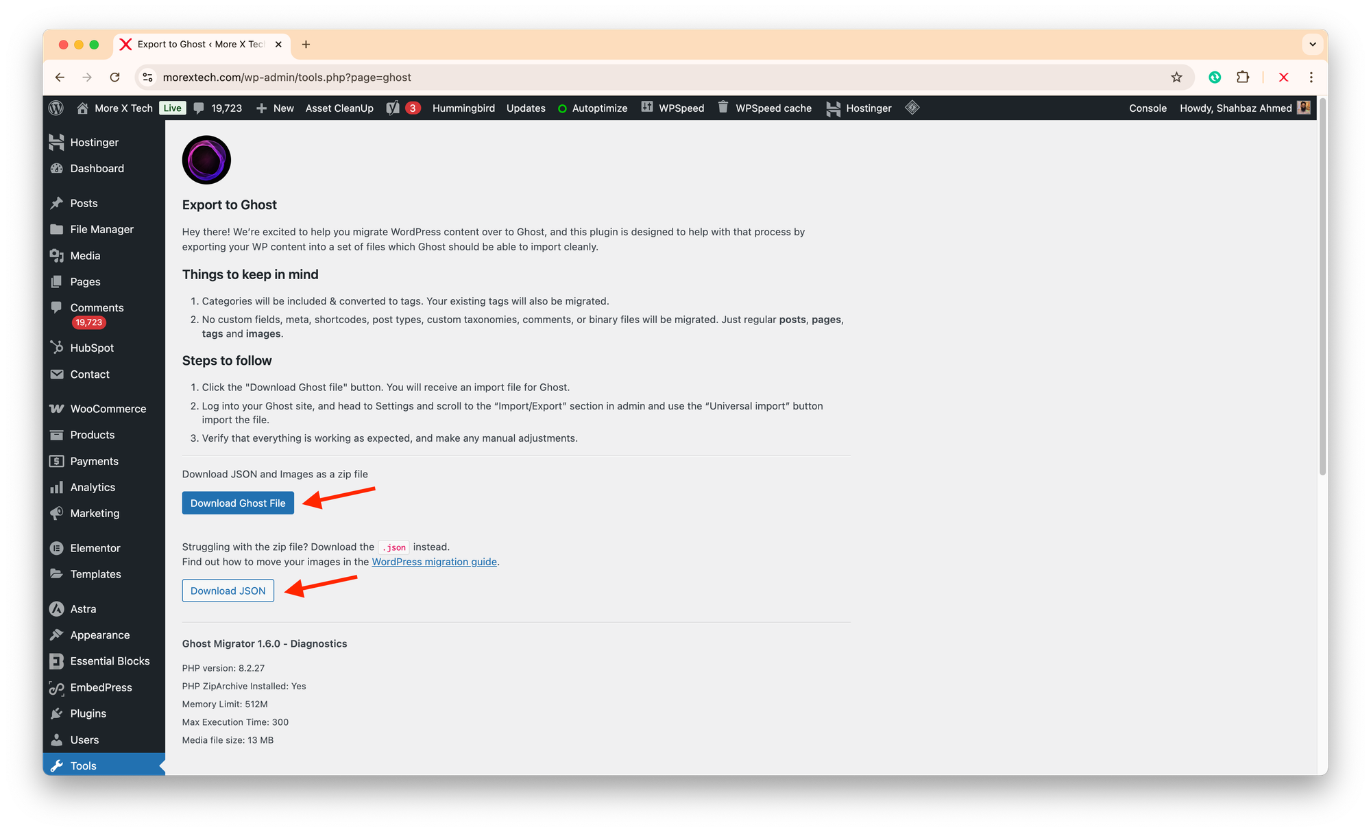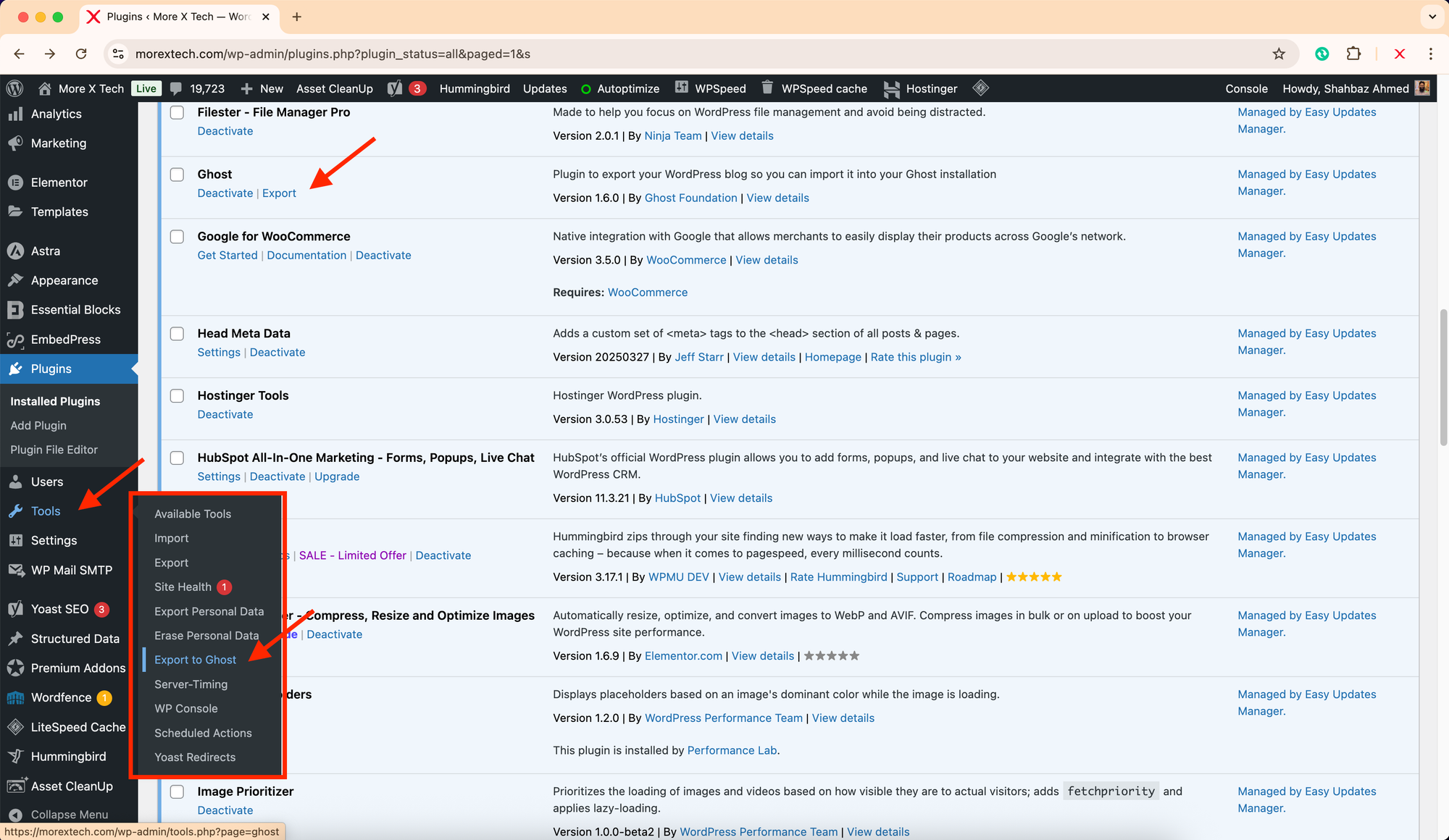 Plugins → Add New → Search “Ghost” → Install “Ghost Export”. - Once installed, use the Export option from Plugins dashboard, or go to Tools → Export to Ghost.